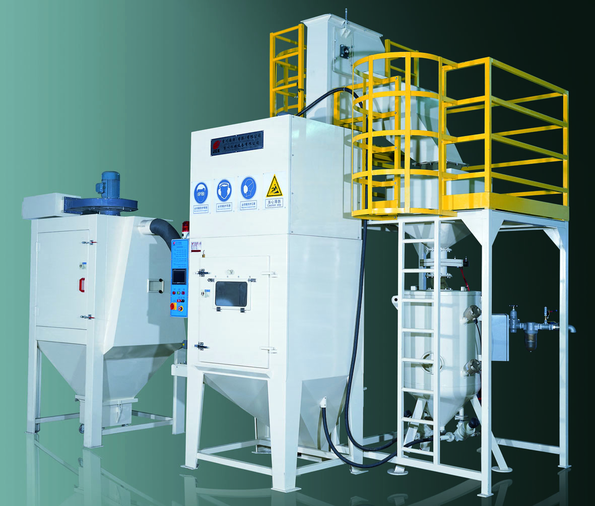 2?丸料和壓縮空氣的混合過(guò)程 丸料和壓縮空氣的三種常見的混合系統(tǒng)是虹吸式系統(tǒng)、重力式系統(tǒng)和直接供料系統(tǒng)。 2.1虹吸式系統(tǒng) 該系統(tǒng)如圖6所示。由于壓縮空氣的速度v2比丸料輸送管道中的速度v1大的多,那么丸料輸送管道中的空氣會(huì)被吸入到壓縮空氣管道中,這就是“虹吸”這個(gè)詞的來(lái)源。由于v1小于v2,那么丸料輸送管道的空氣壓力要高于噴嘴中的壓力。伯努利解釋了這種現(xiàn)象,因此也稱為伯努利定理。如果用p1表示丸料輸送系統(tǒng)中的壓力,用p2表示噴嘴中的壓力,那么我們可以得到: (p1-p2)=1/2.ρA.(v22-v12)?????? ?????????????????????(2)