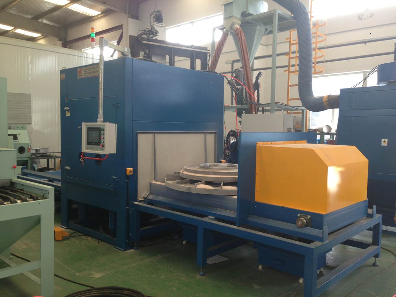 2.3.2主要設備結構 主要由主機噴砂室、轉盤轉動機構、噴槍擺動機構、臺車、電控系統(tǒng)等組;